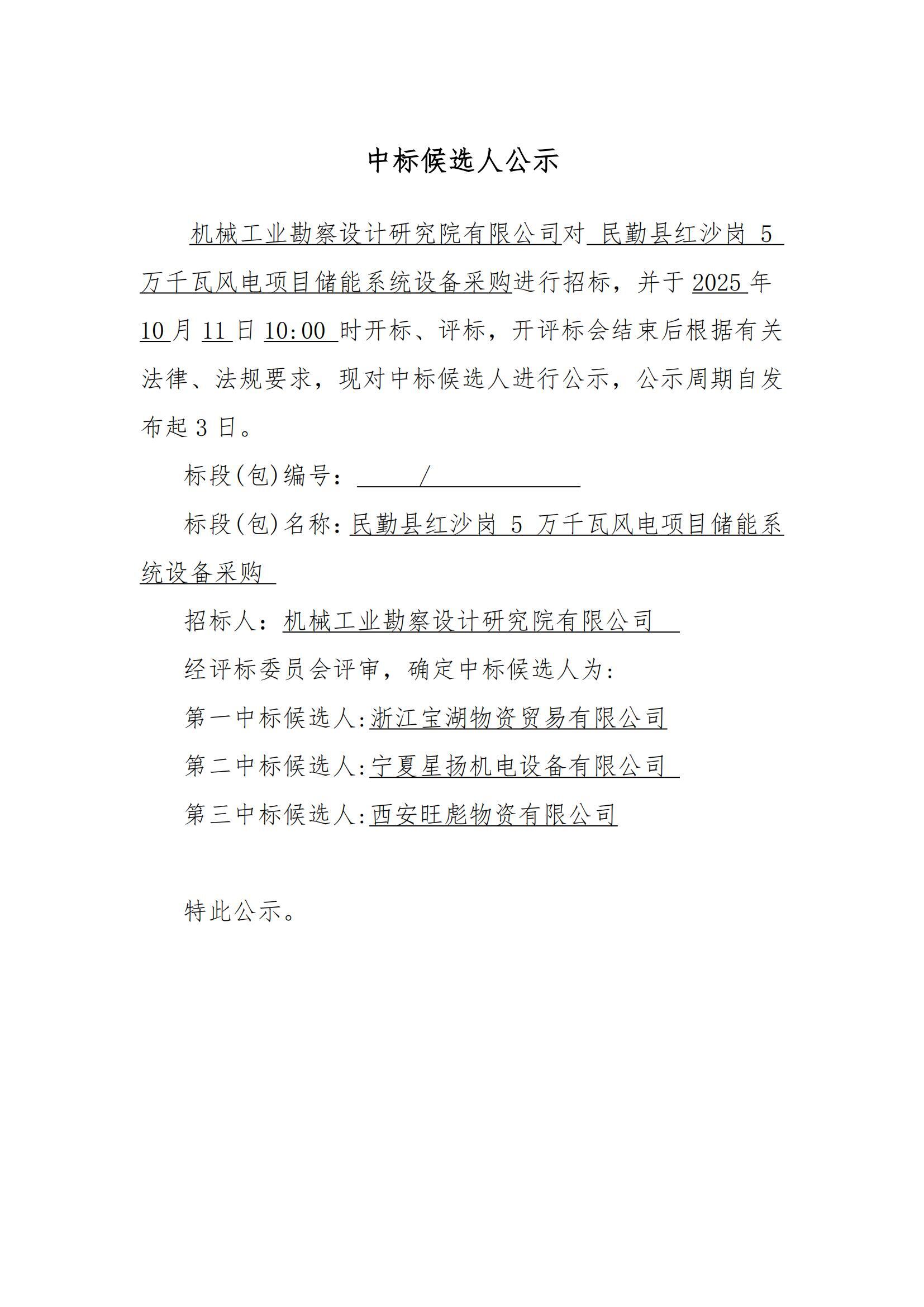 民勤縣紅沙崗 5 萬千瓦風電項目儲能系統(tǒng)設(shè)備采購中標候選人公示